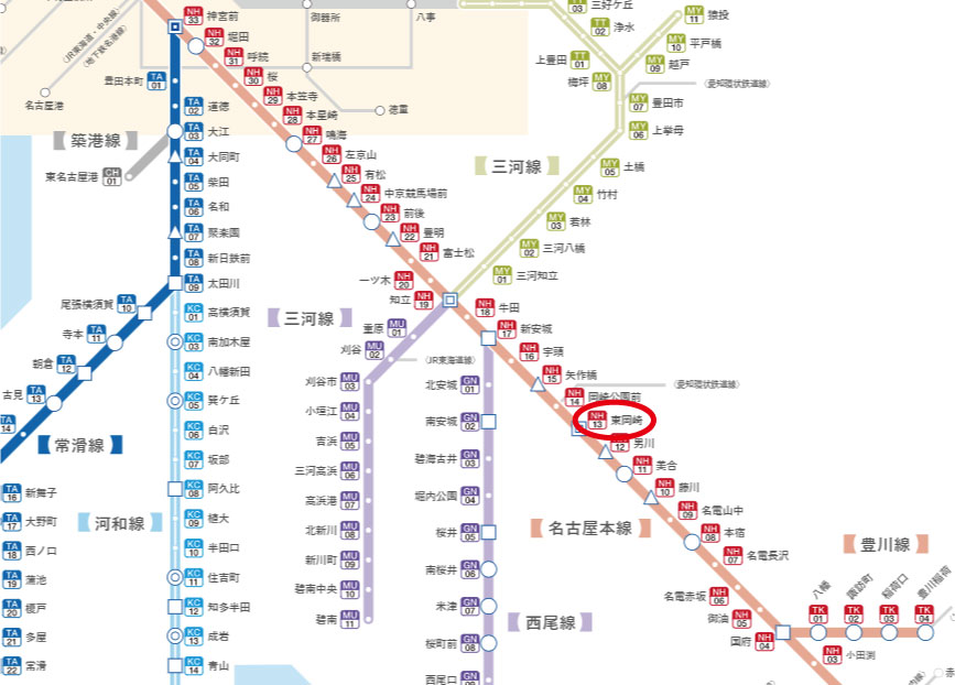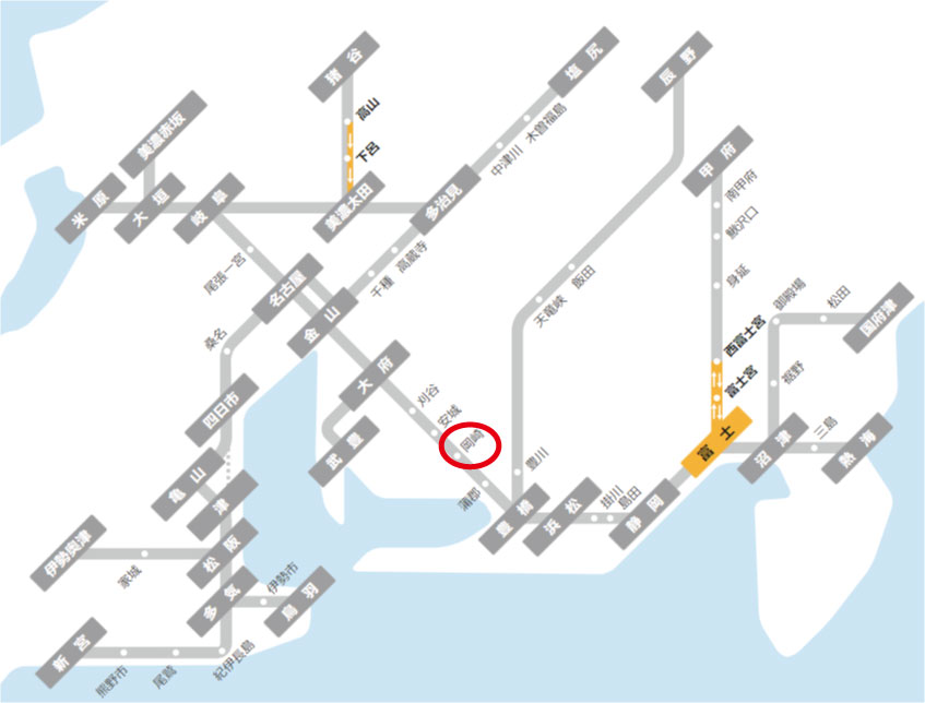| 「JR東海道本線をご利用のお客様」 | JR岡崎駅で愛知環状鉄道に乗換え大門駅下車 | ||||
