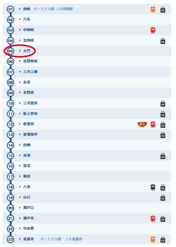 東岡崎駅下車名鉄バスに乗換え